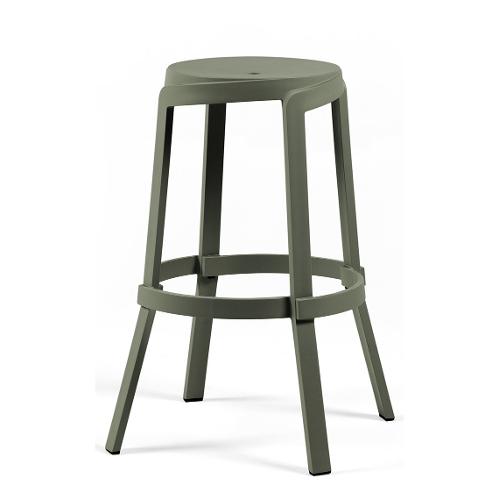 Sgabello alto in plastica riciclata dal design lineare e sezioni ad alto spessore ispirate ai fasci lignei. La particolare mescola blend presenta volute striature uniformate dal color Terra e una texture opacizzata a effetto vintage