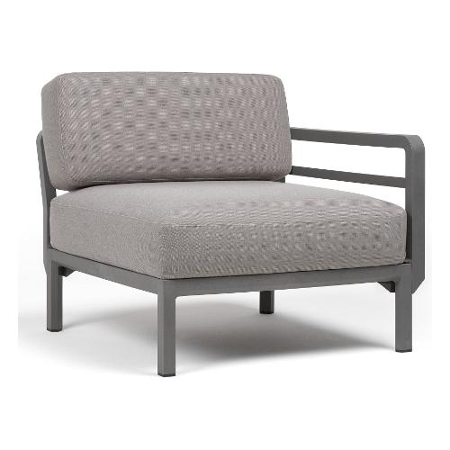 Poltrona con un bracciolo (dx o sx) con struttura in resina rigenerata e tessuti ad alta componente riciclata. Acquistabile singolarmente o progettabile come elemento compositivo centrale del divano modulare MAXIMO