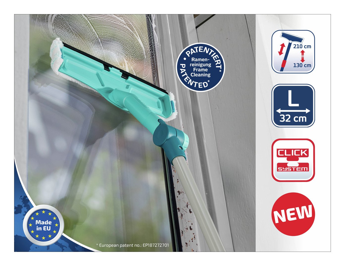 Il tergivetri e telai 4in1 telescope è di alta qualità e combina 4 funzioni in un unico prodotto: finestre e telai possono essere puliti in modo rapido e accurato. Grazie al manico telescopico, è facile raggiungere anche le zone più in alto. Il sistema a 2 fibre del rivestimento micro duo in dotazione rimuove in modo affidabile lo sporco ostinato, come escrementi di uccelli o pollini. Le fibre più grosse sciolgono lo sporco, che viene poi assorbito dalle microfibre. Il rivestimento si applica saldamente al tergivetri e non scivola via. Dopo le pulizie, il rivestimento può essere rimosso grazie al fissaggio in velcro e lavato in lavatrice a 40 °c, così è subito pronto per l'uso successivo. Una particolare innovazione è la funzione di pulizia del telaio brevettata* con un rivestimento che raggiunge e pulisce anche gli angoli e il telaio con una sola passata. Durante la pulizia, la lamina in silicone larga 32 cm rimuove l'acqua in eccesso e garantisce un risultato senza striature. Grazie al bordo gocciolatore, l'impugnatura e le mani restano asciutte, poiché l'acqua viene scaricata in modo pulito. Lo snodo permette di regolare l'angolo del tergivetri, così anche i punti difficili da raggiungere e le superfici più in alto possono essere pulite senza sforzo e senza doversi contorcere. Il manico telescopico con click system è regolabile in continuo da 130 a 210 cm, così non servono scale per la pulizia di verande o balconi. Il tergivetri è comodo e sicuro da impugnare anche senza il manico, grazie all'impugnatura ergonomica, che consente una pulizia rapida e semplice. Se necessario, la lamina in silicone del tergivetri telescopico può essere sostituita senza dover cambiare l'intero tergivetri. *brevetto europeo n.: Ep1872701
