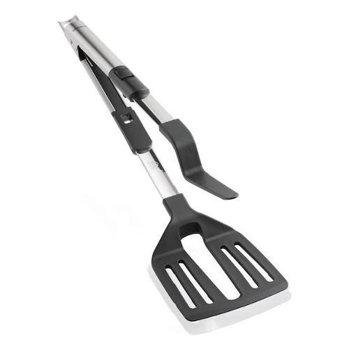 La spatola con pinze di leifheit 2 in 1 è esattamente lo strumento necessario per gli arrosti. Ad esempio, è una spatola stabile per girare le bistecche. E nel giro di pochi secondi si trasforma in una pinza per servire le pietanze in modo sicuro. Il meccanismo di bloccaggio di nuova concezione rende il tutto possibile. È sufficiente sbloccare il meccanismo con il pollice per trasformare la spatola in pinza. L'estremità delle pinze è realizzata in nylon elastico resistente fino ad una temperatura di 160°c che non lascia graffi nemmeno nelle padelle rivestite in teflon. L'impugnatura in acciaio inox risulta gradevole e stabile in mano