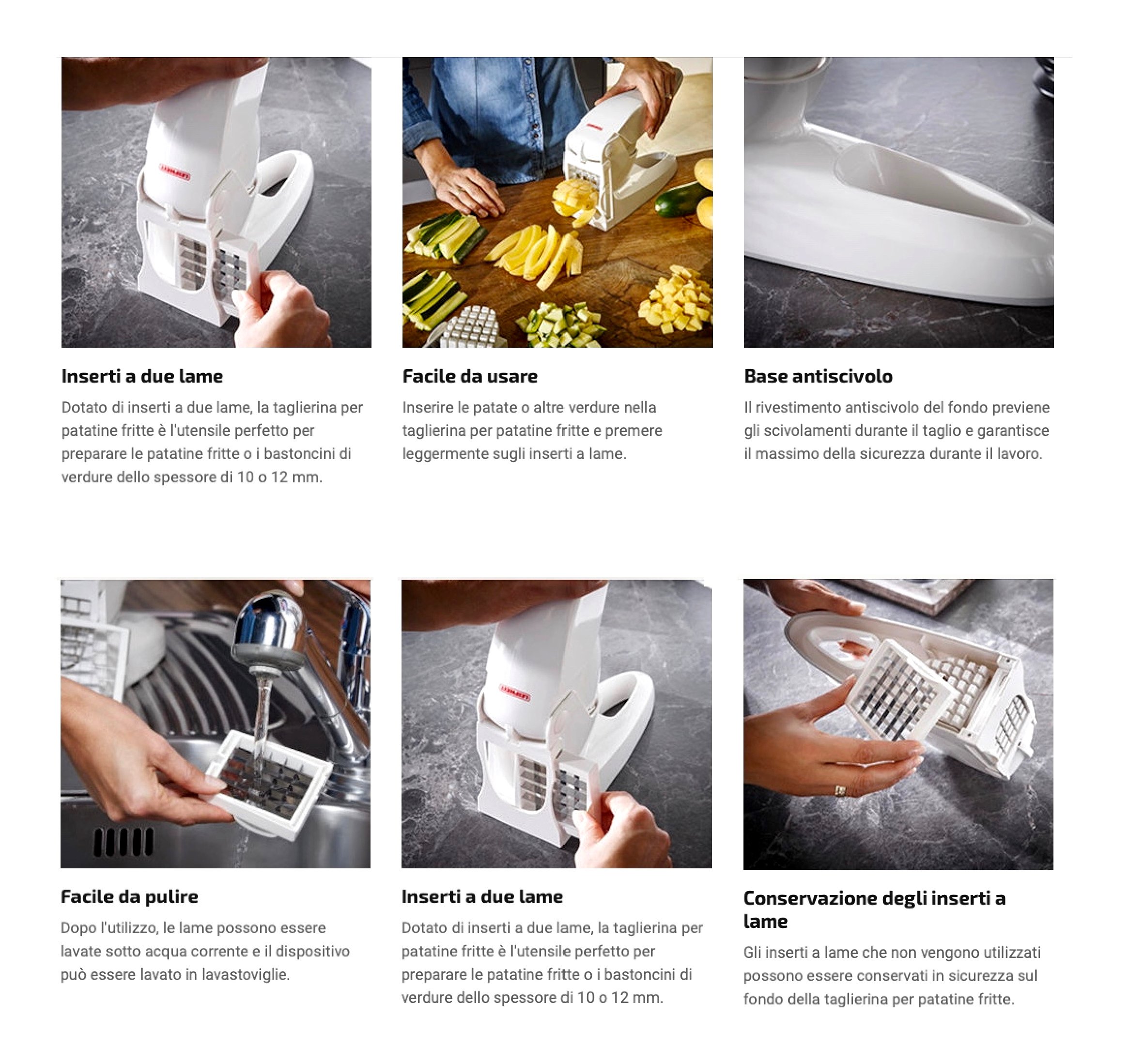 I bastoncini croccanti di patate e di verdure non solo impreziosiscono ogni piatto, ma preparati al forno sono anche sani e deliziosi. Con la taglierina per patatine fritte di leifheit sono disponibili in due grandezze e il risultato è assicurato. Grazie a due inserti a lame si può tagliare istantaneamente una manciata di bastoncini da 10 mm o 12 mm. In un batter d'occhio la piastra del forno è pronta con i bastoncini di patate al rosmarino o con patatine fritte croccanti. Altrettanto velocemente si può preparare una deliziosa insalata con bastoncini di cetrioli, carote o cavoli rapa. I freschi bastoncini di verdura possono essere serviti in accompagnamento a salse, oppure preparati alla griglia: anche i bambini li adoreranno! La taglierina per patatine fritte di leifheit presenta una maneggevolezza particolarmente piacevole. Gli inserti a lame con struttura in plastica possono essere sostituiti in modo facile e sicuro. L'impugnatura ergonomica con zona softtouch antiscivolo ha una presa gradevole e la base con rivestimento antiscivolo garantisce la stabilità, impedendo lo scivolamento durante la fase di taglio. Una volta terminato il lavoro, le lame possono essere lavate sotto acqua corrente e il dispositivo può essere lavato in lavastoviglie.