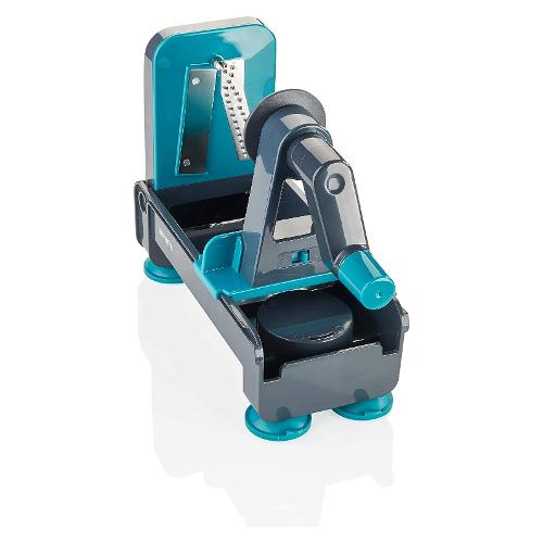 Indipendentemente che si tratti di spaghetti o tagliatelle, coloro che desiderano fare della pasta di verdure deliziosa o patate dolci fritte, possono farlo in tutta semplicità con l’affettatore a spirale da tavolo di leifheit. L’affettatore a spirale da tavolo dispone di tre diverse lame per differenti tipi di pasta. Per cambiare il tipo di taglio si possono sostituire gli inserti a lame in tutta semplicità. Basta semplicemente rimuoverli o inserirli lateralmente. Gli inserti con lama che non vengono utilizzati possono essere riposte nell’apposito contenitore. L’attrezzo dispone di piedini a ventosa che permettono stabilità su tutte le superfici. Impediscono lo scivolamento sulle superfici lisce e garantiscono la stabilità. Il blocca-residui è particolarmente pratico: da un lato consente di lavorare in sicurezza senza pericolo di ferirsi e dall’altro consente di lavorare senza residui. L’affettatore a spirale da tavolo è adatto alla verdura stretta e larga, ad esempio zucchine, carote, cetrioli o anche patate (dolci). Dopo l’utilizzo l’attrezzo può essere pulito facilmente senza lasciare residui, a mano o sotto l’acqua corrente o in lavastoviglie. Le lame sono in acciaio inox e quindi sono di lunga durata e adatte alla lavastoviglie. L’affettatore a spirale da tavolo di leifheit può essere smontato completamente e chiuso in modo compatto per essere riposto occupando poco spazio.