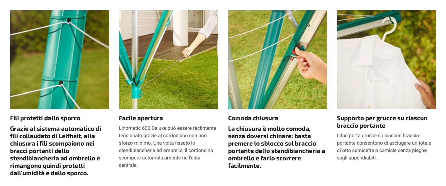 Lo stendibiancheria a ombrello linomatic 500 deluxe cover di leifheit è dotato di un efficiente sistema di recupero automatico dei fili che permette una pratica asciugatura del bucato all’aria aperta. Come per tutti gli stendibiancheria a ombrello linomatic, una volta chiuso, i fili rimangono al riparo dallo sporco nei bracci portanti - fili puliti per un bucato pulito! È possibile aprire la linomatic 500 deluxe cover con il minimo sforzo, poiché il sistema easy-lift ottimizzato consente un ulteriore risparmio di forze del 20% rispetto agli altri modelli linomatic. È sufficiente azionare l'anello di trazione per tendere i fili. Grazie alle piccole unità a scatto, i fili rimangono ben tesi anche dopo anni di utilizzo. Il recupero automatico dei fili garantisce la loro protezione, mentre l'anello di trazione, non rimanendo a terra, permette di evitare eventuali inciampi o intralci durante la rasatura del prato. Grazie al meccanismo easy close comfort lo stendibiancheria a ombrello si chiude comodamente e senza fatica. Premendo un pulsante sul braccio portante è possibile sbloccare il sistema senza difficoltà. In questo modo è possibile chiudere facilmente lo stendibiancheria linomatic 500 deluxe cover con un semplice scatto e un solo dito, senza necessità di chinarsi. Grazie al sistema automatico di fili collaudato, questi vengono ritirati automaticamente e rimangono protetti all’interno dei bracci portanti. Al prossimo impiego si tendono nuovamente in automatico. I fili sporchi che negli stendibiancheria a ombrello lasciano segni orribili sul bucato appartengono al passato. La custodia protettiva inclusa, offre una protezione completa e affidabile allo stendibiancheria a ombrello grazie al suo materiale solido e resistente agli agenti atmosferici. Con una lunghezza complessiva dei fili di 50 metri lo stendibiancheria linomatic 500 deluxe cover offre spazio sufficiente per cinque carichi di lavatrice da asciugare contemporaneamente all’aria aperta. Quindi il bucato si asciuga in modo delicato e naturale senza consumare elettricità. Su ogni braccio portante si trovano inoltre due supporti per grucce per garantire un'asciugatura senza pieghe fino a otto camicie e camicette. Grazie alla lunghezza massima dei fili di 2,03 metri lo stendibiancheria linomatic 500 deluxe cover consente di stendere anche capi di bucato grandi, quali lenzuola e coperte. Tutti i materiali sono resistenti agli agenti atmosferici e ai raggi uv. Custodia protettiva e inserto per il fissaggio a terra inclusi. Sono disponibili come accessori il tassello a terra per avvitare e il comodo supporto per capi di piccole dimensioni easyclip per appendere senza mollette fino a 38 capi di piccole dimensioni. Made in germany.