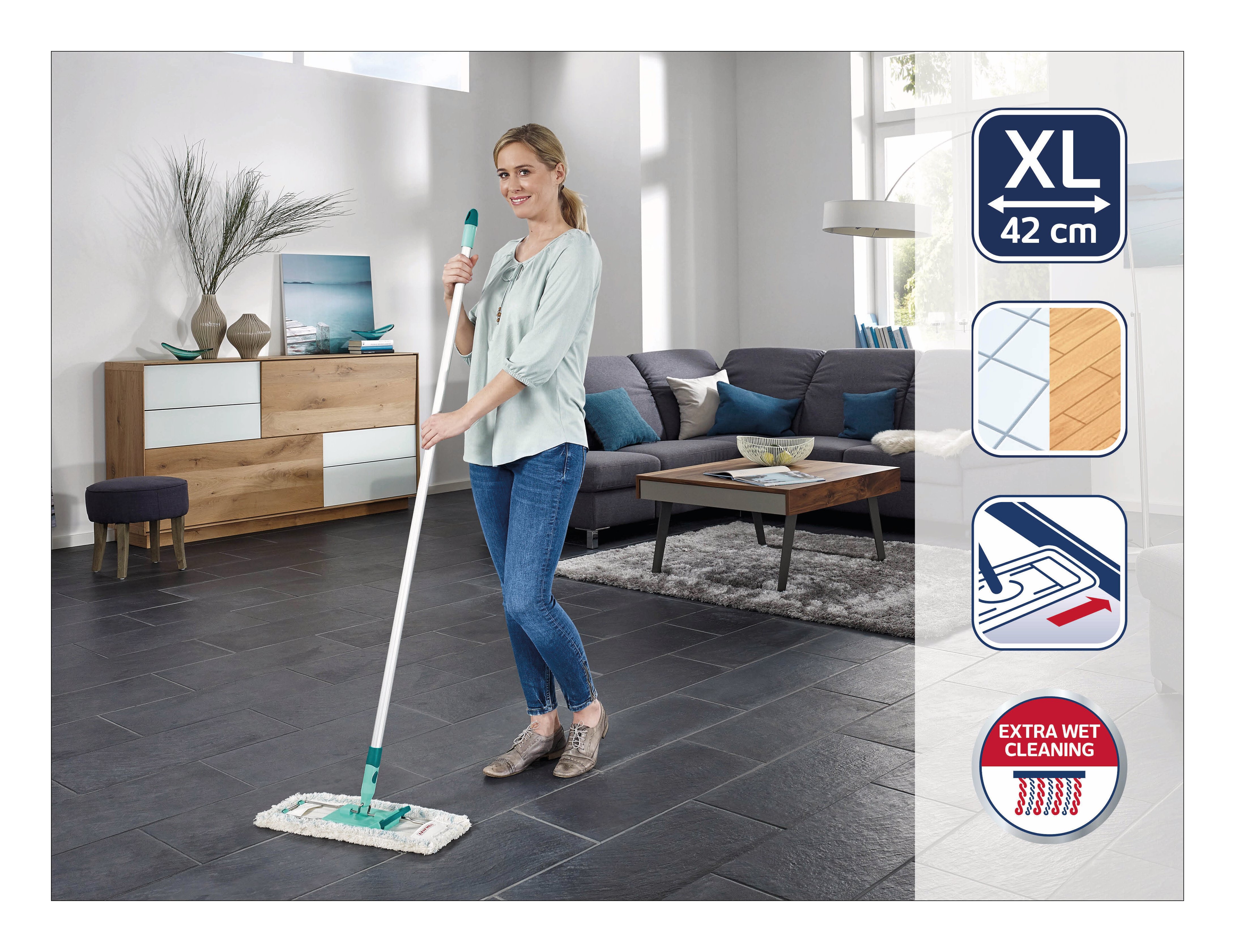 durante la pulizia e agli antiestetici aloni: Profi XL micro duo di Leifheit, grazie al suo rivestimento speciale a 2 fibre, rimuove anche lo sporco più ostinato e