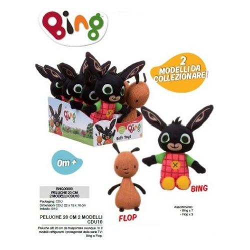 Peluche alti 20 cm da trasportare ovunque. In 3 modelli raffiguranti i protagonisti della serie tv: bing, flop e sula