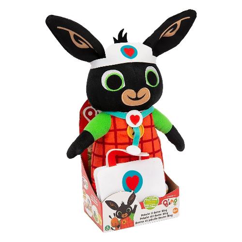 Bing in morbido peluche in versione dottore. Bing indossa la cuffietta da medico, e tiene in mano la borsa da dottore realizzata in materiale soffice. Completa il set lo stetoscopio removibile, anch'esso realizzato in materiale morbido. La confezione include un set di adesivi: cerotti colorati, e stemmi "sono stato bravo dal dottore"