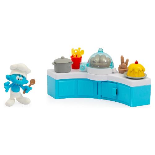 Mini playset con accessori e un puffo 5,5 cm incluso. La cucina di puffo chef: la cloche del pane si apre a ribalta e l’antina sotto il bancone si apre . Il set include una cloche del pane e un'antina apribile, offrendo accessori autentici che arricchiscono la creatività durante il gioco.