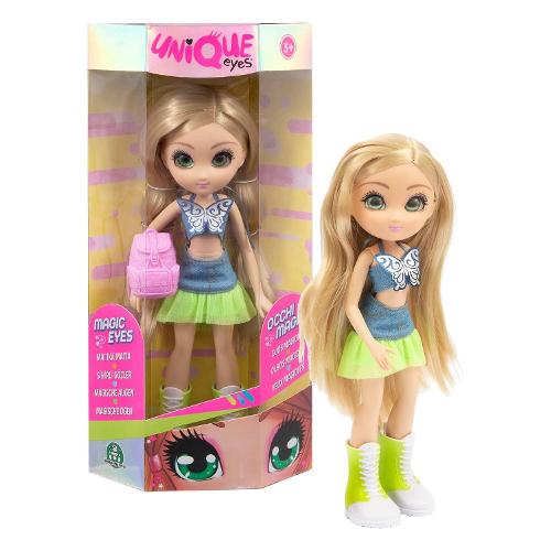 Guarda gli occhi della tua bambola unique eyes, ti segue sempre dallo sguardo quando ti muovi. La bambola unique eyes indossa abiti alla moda. Scambia gli abiti con le altre bambole unique eyes per creare ancora più look!