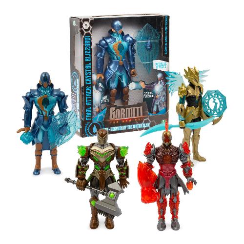 Action figure alte 27 cm articolate e raffiguranti i quattro gormiti. Il personaggio include un accessorio personalizzato che riproduce l’arma del gormita. Il personaggio è dotato di una funzione attacco che replica la caratteristica mossa d’attacco vista nella serie tv. Inoltre possiede funzione luce che illumina punti specifici del corpo.