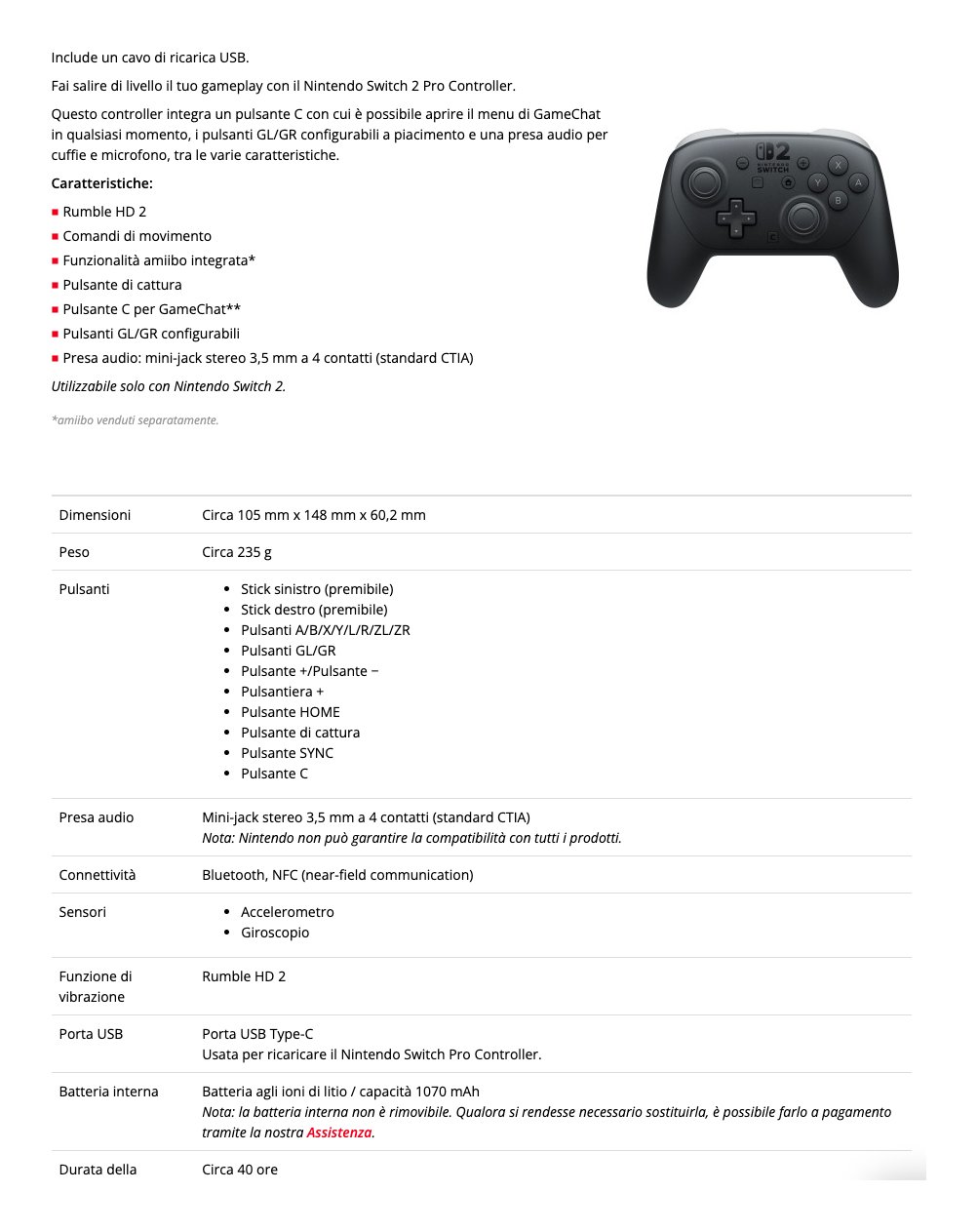Fai salire di livello il tuo gameplay con il Nintendo Switch 2 Pro Controller. Questo controller integra un pulsante C con cui è possibile aprire il menu di GameChat in qualsiasi momento, i pulsanti GL/GR configurabili a piacimento e una presa audio per cuffie e microfono, tra le varie caratteristiche. Durata della batteria circa 40 ore.
