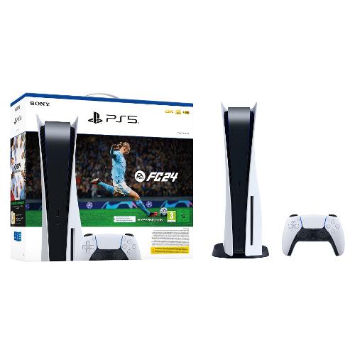 Il pacchetto include una console PlayStation 5 e un controller wireless DualSense, un buono per EA Sports FC 24 (gioco completo) e un buono per contenuti digitali scaricabili per EA Sports FC 24 Ultimate Team