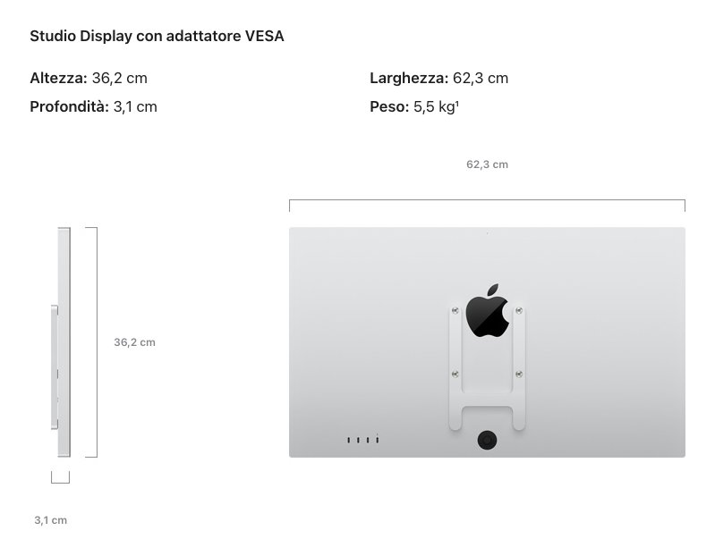 Uno spettacolare display Retina 5K da 27" con videocamera e audio eccezionali. Progettato per la massima flessibilità, Apple Studio Display con vetro nanotexture e adattatore VESA consente di essere montato su supporti compatibili da 100×100 mm, sia in orientamento orizzontale che verticale.