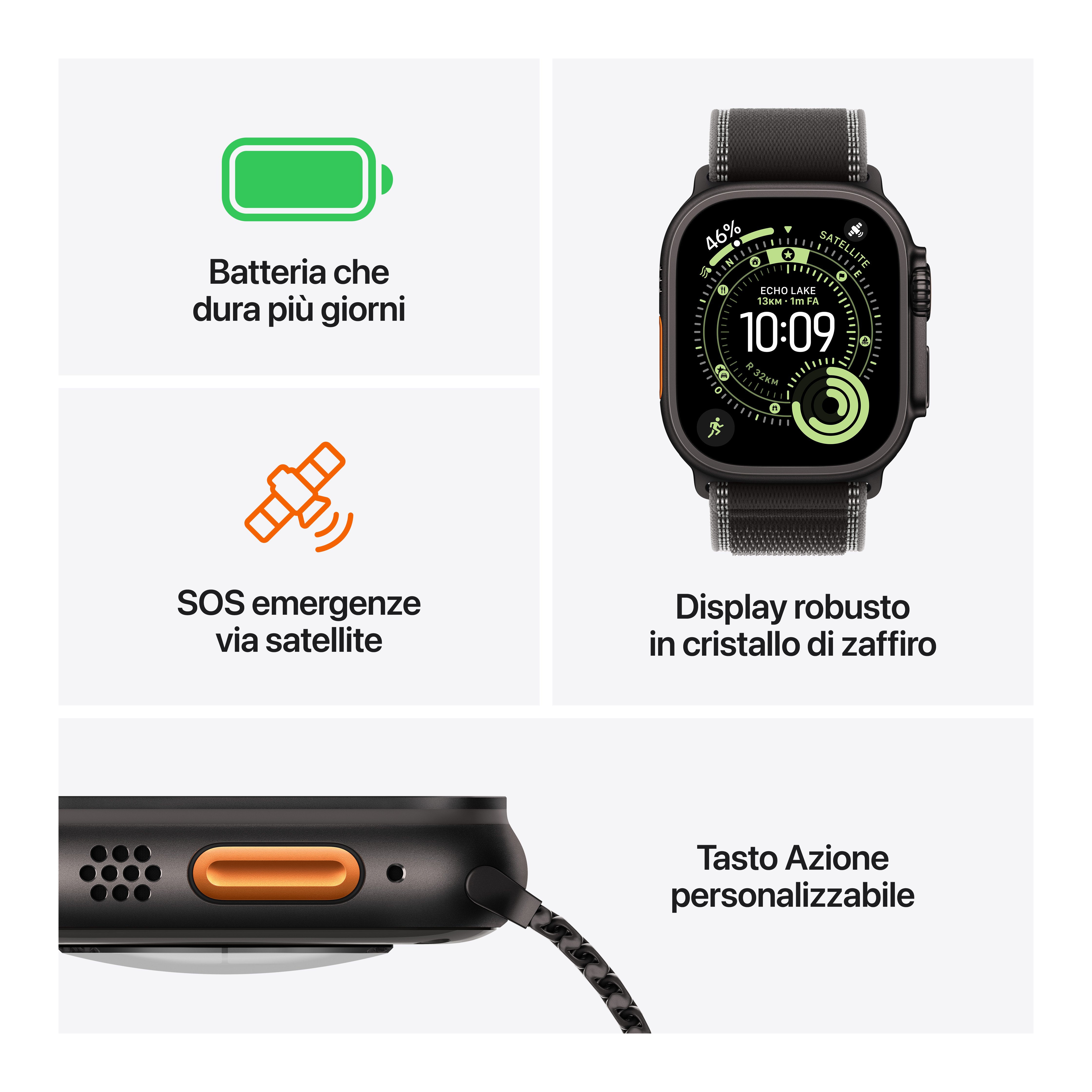Apple Watch Ultra 3 ora offre funzioni satellitari integrate, autonomia di più giorni, il display per Apple Watch più ampio e luminoso, parametri evoluti, allenamenti personalizzati e GPS a doppia frequenza. In più ti fornisce informazioni preziose sulla sua salute, come le notifiche in caso di frequenza cardiaca troppo alta o troppo bassa e i dati sulla qualità del sonno. È proprio Ultra, di nome e di fatto.