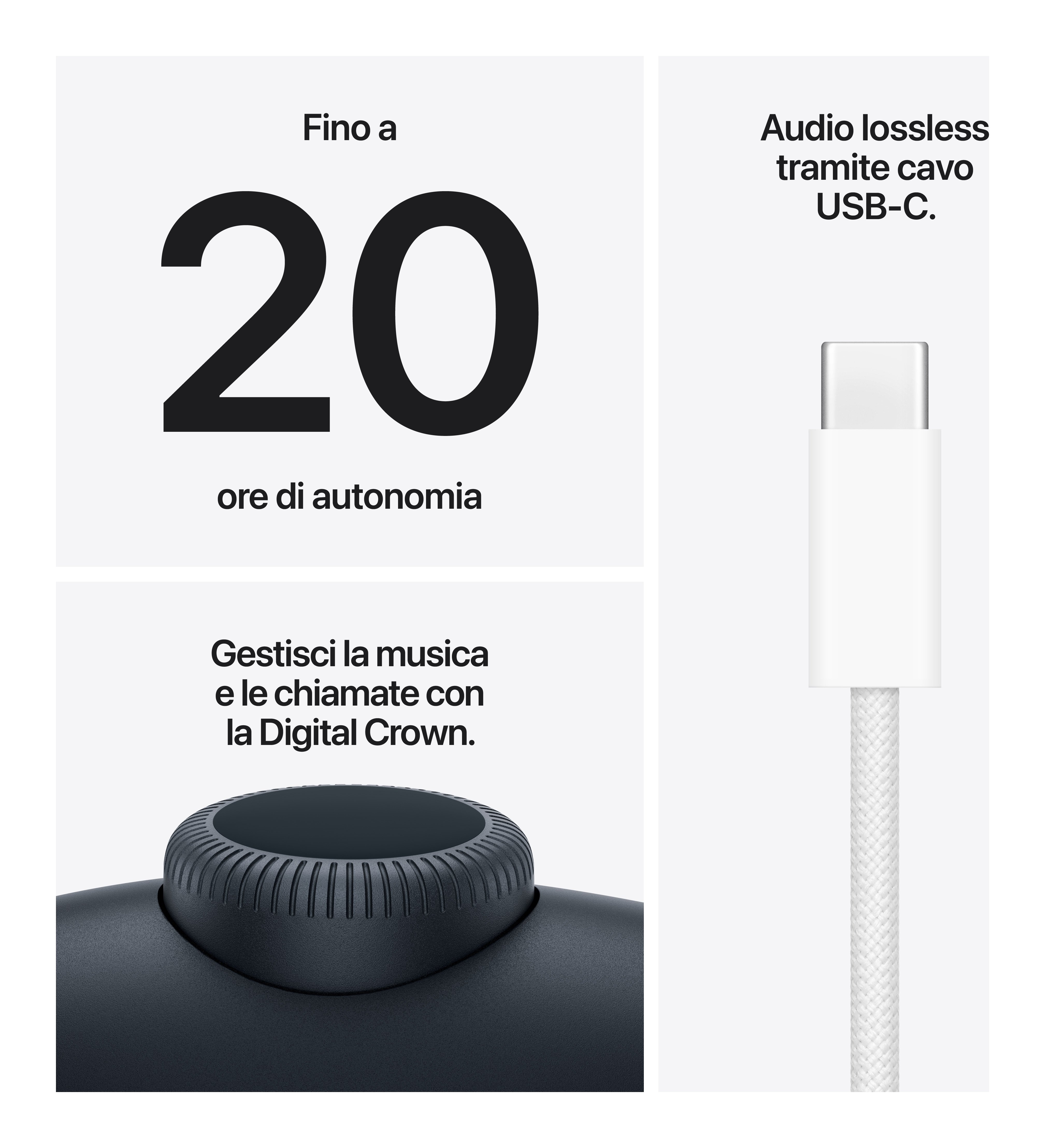 L’ascolto cambia musica. AirPods Max 2. Cancellazione attiva del rumore fino a 1,5 volte più efficace rispetto alla generazione precedente e suono ad alta fedeltà migliorato: le cuffie over ear per un ascolto sublime