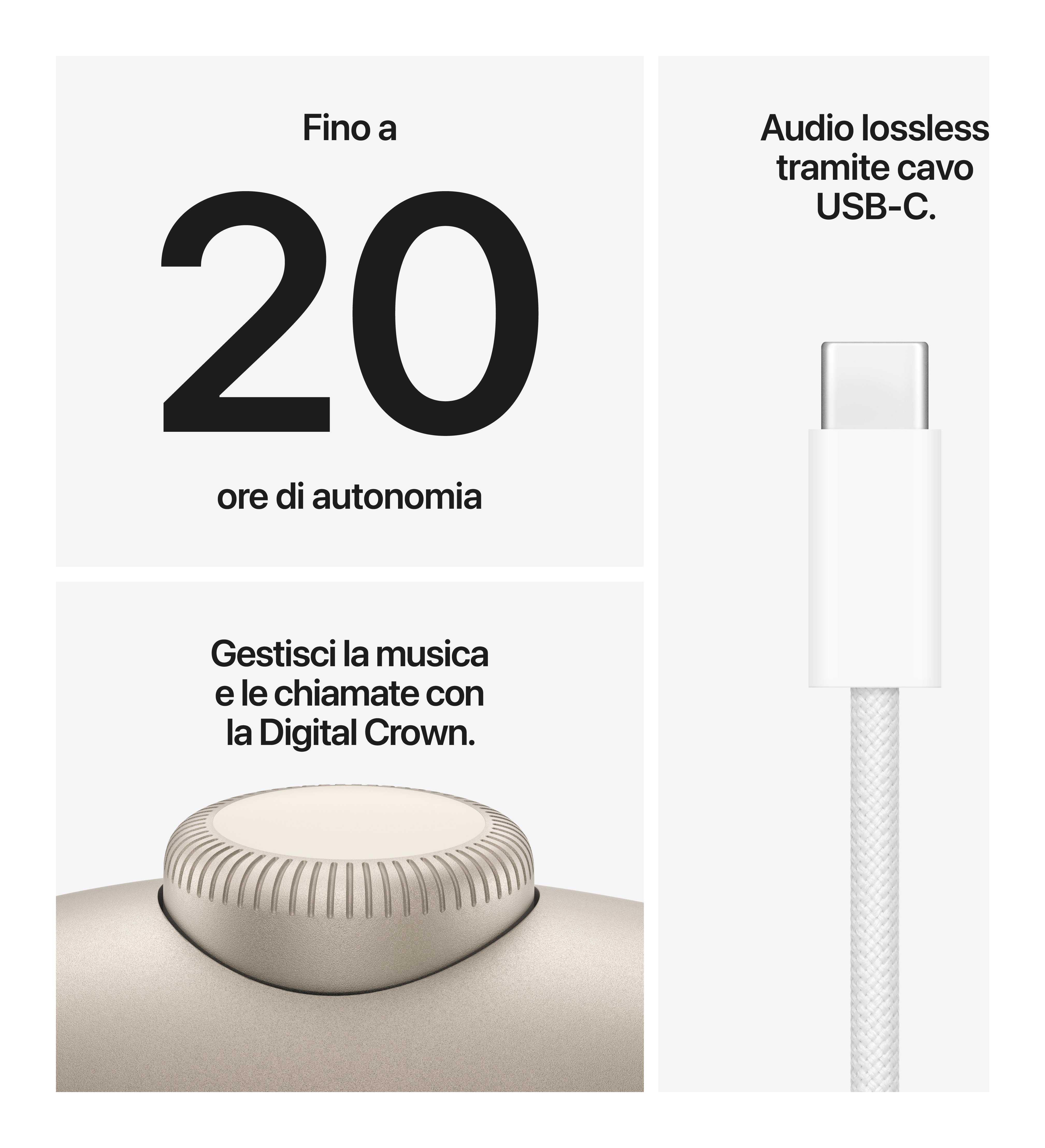 L’ascolto cambia musica. AirPods Max 2. Cancellazione attiva del rumore fino a 1,5 volte più efficace rispetto alla generazione precedente e suono ad alta fedeltà migliorato: le cuffie over ear per un ascolto sublime