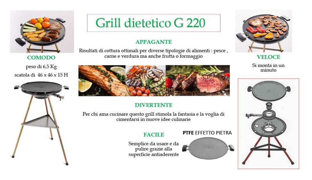 Grill a gas dotato di una capiente piastra di cottura con rivestimento in teflon PTFE ideale per una cottura dietetica veloce; cuoce i cibi eliminando i grassi in eccedenza mantenendo inalterate le proprietà nutritive e i sapori.