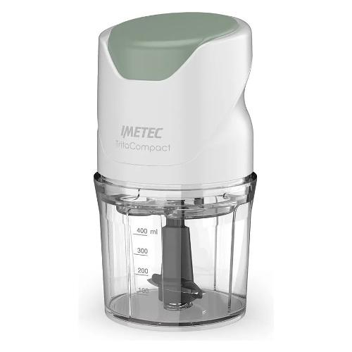 Trita e sminuzza in modo omogeneo verdura, frutta secca e formaggio. Il tritatutto IMETEC TritaCompact è compatto, ideale per un uso quotidiano. Motore di 350 W, due lame in acciaio inox extra large. Il contenitore da 400 ml consente di lavorare fino a 200 g di alimenti per tutte le preparazioni di base in cucina. Funzionamento a pressione.