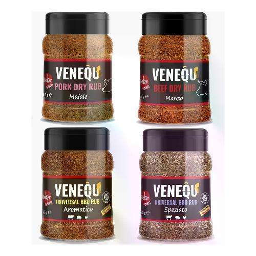 I BBQ Rub di VENEQU sono delle miscele di spezie per grigliata di carne e non solo a base di elementi naturali di alta qualità, selezionati ed importati direttamente dalle origini presso fornitori qualificati. Non ci sono prodotti di sintesi o elementi chimici e sia le spezie che le erbe vengono acquistate intere e macinate con tecnologie dedicate alle caratteristiche organolettiche dei vari aromi.