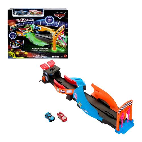 Pronti, partenza, FLUO! Il protagonista di Disney Pixar Cars Saetta McQueen e il suo rivale Jackson Storm si affrontano in una nuova gara da brividi. Il playset Corsa Fluo con Incrocio è il luogo perfetto in cui mettere in mostra le macchinine da corsa Cars che brillano al buio. Con le due modalità di gioco e l'effetto fluo, i bambini possono far sfrecciare le macchinine da corsa in 'modalità giorno' o riconfigurarle in 'modalità notte' per lanciarle in salti acrobatici agli incroci. Il playset include le macchinine da corsa Saetta McQueen e Jackson Storm che brillano al buio: i fan daranno il via alla gara non appena è tutto pronto!