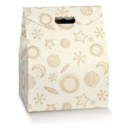 Scatola in cartone accoppiato con maniglia. Può contenere 1 panettone da 750gr./1kg + bottiglia oppure prodotti enogastronomici vari. Peso raccomandato: 3,5/7kg.
