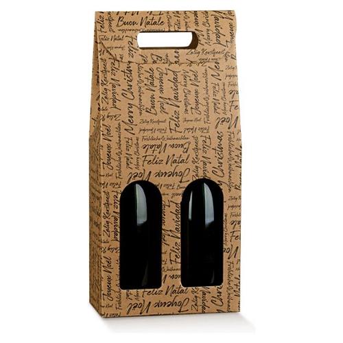 Scatola con maniglia per confezionare 2 bottiglie verticali modello bordolese, borgognotta. Il cartone fustellato delle finestre si utilizza come separatore per le bottiglie.