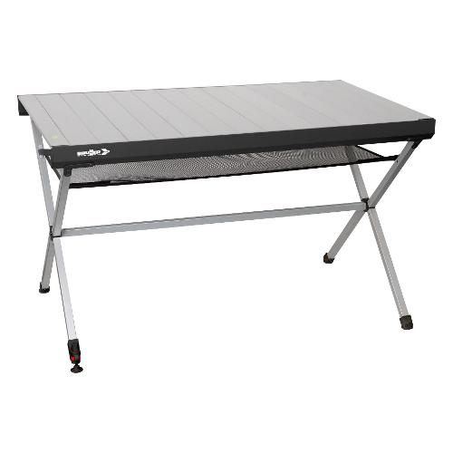 Tavolo in alluminio brevettato con ripiano arrotolabile e speciale telaio pieghevole di facile montaggio, livella a bolla integrata, piedino regolabile