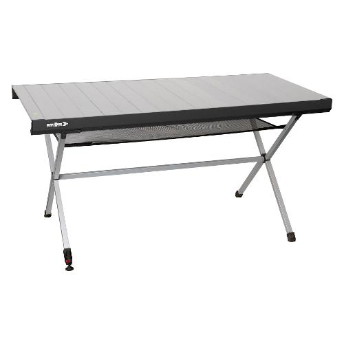 Tavolo in alluminio brevettato con ripiano arrotolabile e speciale telaio pieghevole di facile montaggio, livella a bolla integrata, piedino regolabile