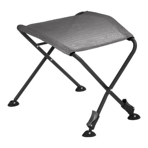 Poggiapiedi indipendente per sedie camping, realizzato con un robusto telaio in alluminio tubolare tondo, dotato di gambe anteriori telescopiche regolabili in altezza e piedini girevoli anti-affondamento per garantire stabilità su qualsiasi terreno