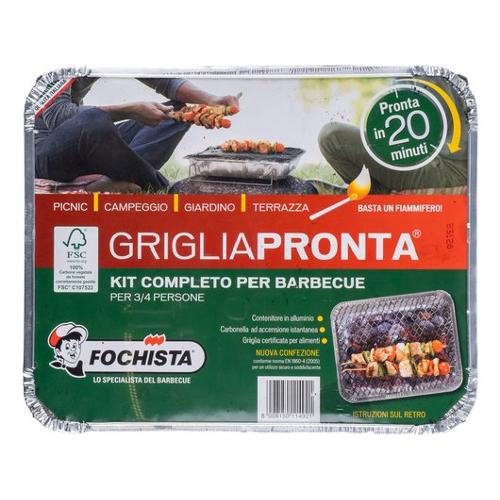 Carbonella ad accensione istantanea, contenitore in alluminio, griglia certificata per alimenti.