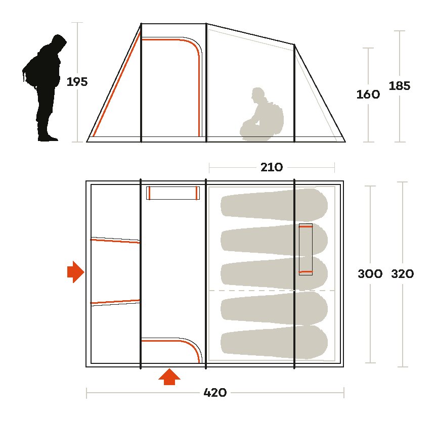 Tenda 5 posti spaziosa e confortevole dotata di ampio abside anteriore che la rendono ideale per il campeggio stanziale. Sistema “air ventilation system” con ampia zanzariera; cuffie di ventilazione e finestre | ampio abside anteriore | frontale e laterale | porte camera con zanzariera | porta laterale doppio tetto con zanzariera interna.