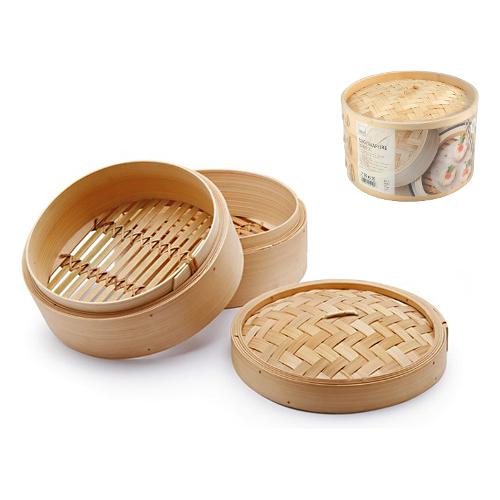 Cestello orientale per la cottura a vapore. Utilizzato sopra una pentola o un tegame con acqua senza arrivare a toccare il fondo del cestello il vapore si propaga attraverso i piani portando a cottura i cibi. La cottura a vapore conserverà le proprietà nutritive degli alimenti. È consigliato per la cottura di carni bianche, pesce, verdura e ravioli.