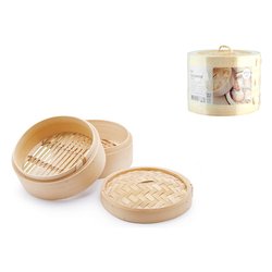 Cestello orientale per la cottura a vapore. Utilizzato sopra una pentola o un tegame con acqua senza arrivare a toccare il fondo del cestello il vapore si propaga attraverso i piani portando a cottura i cibi. La cottura a vapore conserverà le proprietà nutritive degli alimenti. È consigliato per la cottura di carni bianche, pesce, verdura e ravioli.