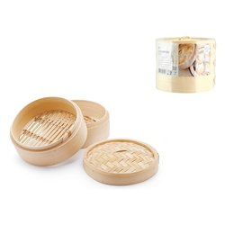 Cestello orientale per la cottura a vapore. Utilizzato sopra una pentola o un tegame con acqua senza arrivare a toccare il fondo del cestello il vapore si propaga attraverso i piani portando a cottura i cibi. La cottura a vapore conserverà le proprietà nutritive degli alimenti. È consigliato per la cottura di carni bianche, pesce, verdura e ravioli.