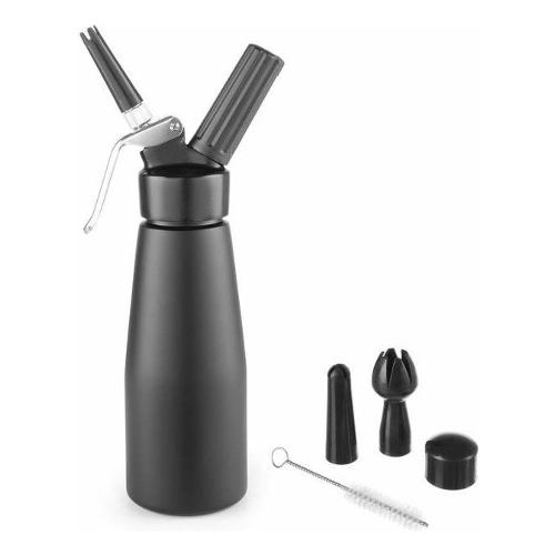 Il contenitore è in alluminio, mentre i beccucci sono in plastica. Funziona con comuni capsule n2o che non sono incluse nella confezione.