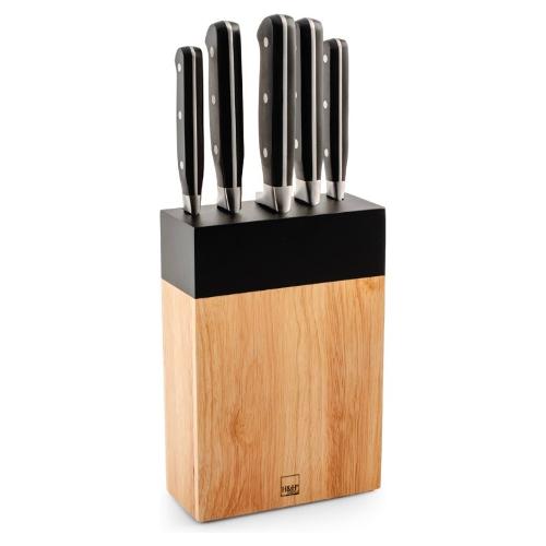 Questo set di coltelli, con ceppo in legno chiaro rifinito con dettagli neri, unisce estetica e funzionalità. I cinque coltelli, caratterizzati da manici forgiati neri, sono dotati di lame in acciaio inox per garantire resistenza e precisione nel taglio. Un'opzione completa e raffinata per chi cerca un'attrezzatura da cucina di qualità, con un design elegante e moderno.