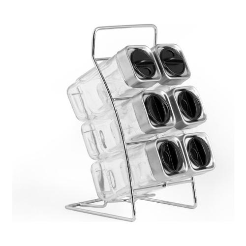 Porta spezie dotato di 6 barattoli in vetro trasparente e di un elegante supporto in acciaio inox. Perfetto per avere sempre a portata di mano le spezie più usate, risparmiando spazio in cucina. I barattoli sono facili da pulire e possono essere lavati in lavastoviglie senza tappo, per la massima praticità.