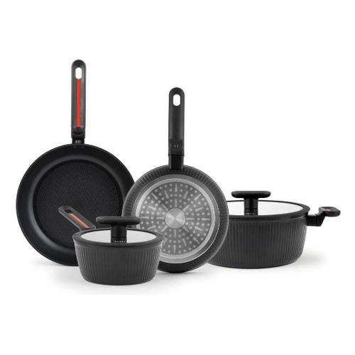 Composizione: 1 casseruola 24 cm, 1 casseruola 16 cm, 1 padella 24 cm, 1 padella 26 cm, 2 coperchi vetro (16 e 24 cm) con bordo silicone e valvola sfiato