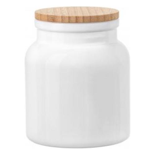Una forma che trae ispirazione da contenitori utilizzati in epoca Vittoriana realizzata in vetro opale con tappo in bambù naturale ed è indicata per contenere alimenti secchi come zucchero, sale, caffè, ecc. Il vaso nella versione bianca, senza decori, può essere utilizzato anche in una stanza da bagno per contenere batuffoli di cotone o altri accessori.