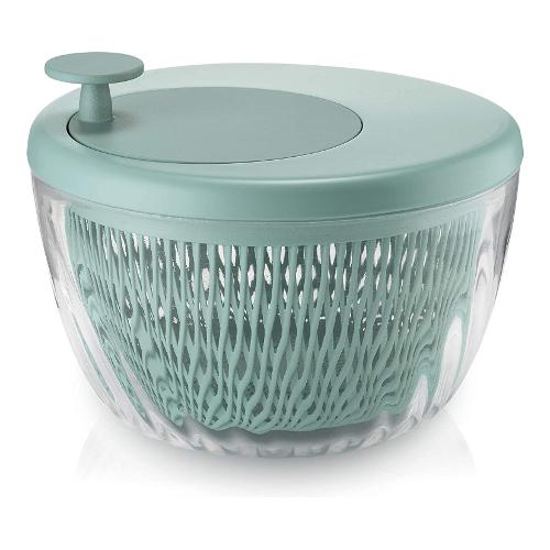 Centrifuga per insalata spin&store lava e asciuga l'insalata e tutte le verdure a foglia grande in modo rapido ed efficace. Dal design compatto, il suo contenitore, può diventare un'elegante insalatiera da portare in tavola. Il cestello all'interno è dotato di piedini che lo tengono sollevato dalla base del contenitore: questo particolare permette di utilizzare la centrifuga anche come contenitore per scongelare i cibi che, restando sollevati dal fondo grazie ai piedini, non rimangono bagnati. La centrifuga è inoltre dotata di un coperchio salvafreschezza che, applicato al contenitore, permette di conservare in frigo le verdure.