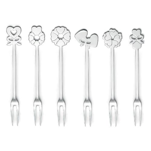 Set 6 forchettine da aperitivo in acciaio e impreziositi da un decoro sul sommo dell'impugnatura che parla il linguaggio del cuore rappresentando nodi d'amore, fiori, cuoricini con un segno grafico contemporaneo. Creati con una missione speciale: rendere attuali, eleganti e originali le bomboniere degli sposi moderni.