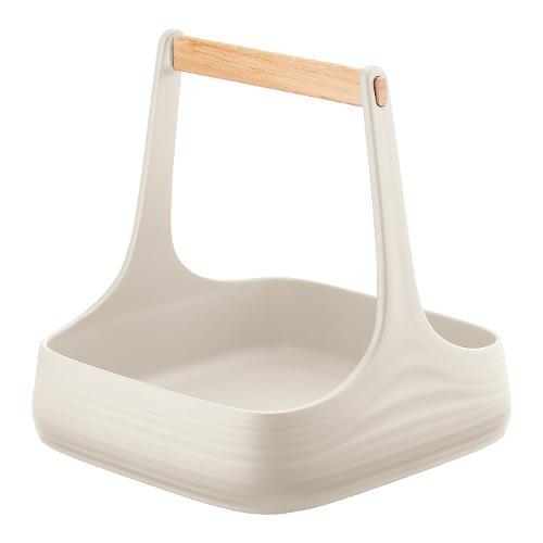 All together, ideale per trasportare con facilità dalla cucina alla tavola i condimenti, le spezie, il miele, le marmellate ma anche per mantenere il top cucina in ordine o la tavola pulita. All together è un ottimo alleato anche nelle cene outdoor e può fungere da portatovaglioli.L’ampia Base realizzata in materiale plastico riciclato garantisce la tenuta di tutti gli oggetti contenuti all’interno mentre il manico in legno, un dettaglio prezioso che troviamo anche in altri prodotti della stessa collezione, permette un trasporto sicuro. La sua versatilità lo porterà ad essere a tavola con noi dalla colazione alla cena e anche nelle merende pomeridiane di grandi e piccini nella versione portatovaglioli.