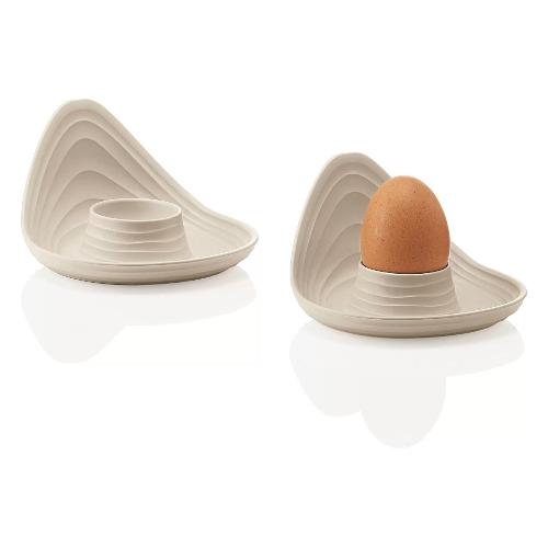 Un portauovo dalla forma contemporanea che non trascura la funzionalità. L'ala laterale, che è la particolarità della sua originale forma, serve anche per facilitare la presa del piattino stesso, mentre la base del portauovo può ospitare il cucchiaino e i pezzi di guscio e la sua impilabilità gli garantisce il plus di essere facile da riporre e salva-spazio. Realizzato in materiale plastico riciclato 100% post consumo.