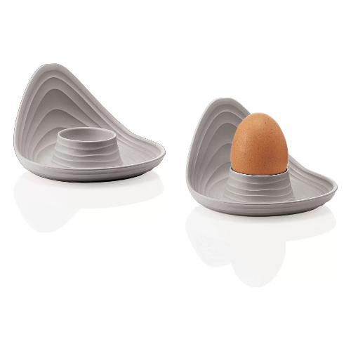 Un portauovo dalla forma contemporanea che non trascura la funzionalità. L'ala laterale, che è la particolarità della sua originale forma, serve anche per facilitare la presa del piattino stesso, mentre la base del portauovo può ospitare il cucchiaino e i pezzi di guscio e la sua impilabilità gli garantisce il plus di essere facile da riporre e salva-spazio. Realizzato in materiale plastico riciclato 100% post consumo.