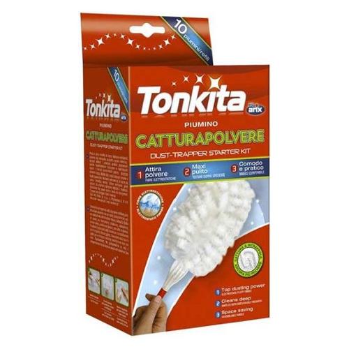 Piumino kit cattura-polvere ideale per un rapido ed efficace spolvero di mobili, librerie, lampadari, schermi tv, pc, impianti hi-fi. Piumino con migliaia di sottilissime e soffici fibre ad elevato potere elettrostatico, per imprigionare la polvere e lo sporco minuto. Grazie alla sua forma morbida e flessibile, si adatta alle superfici da pulire e penetra negli spazi più difficili. Contiene 10 piumini ricambio.