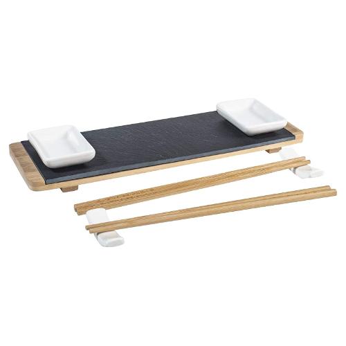 Composto da: 1 vassoio bambù cm 30x10; 1 piatto in ardesia cm 27x10; 2 coppette porcellana cm 7,5x5;2 paia di bacchette cm 24; 2 porta bacchette cm 6x1,5