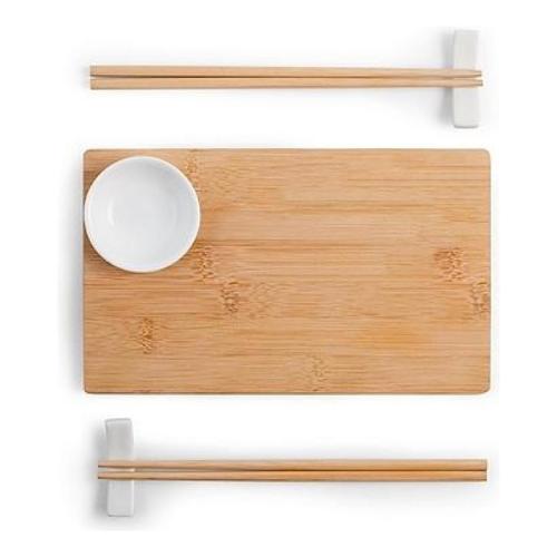 Contiene 1 tagliere in bamboo 24,5x14,5, 1 coppetta in porcellana bianca 7,5x2h, 2 porta bacchette in porcellana bianca e 2 paia di bacchette in bamboo