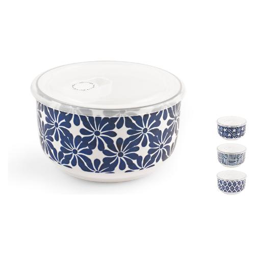 Contenitore seta in porcellana decorata colore blu e avorio con coperchio in polipropilene trasparente con valvola e con datario lt 1. Adatto all'uso al microonde