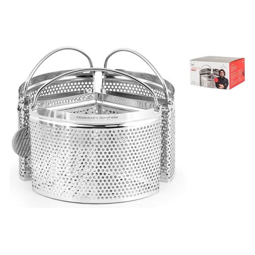 Il triplo cestello tondo in acciaio inox permette di cucinare contemporaneamente differenti tipi di pasta con diversi tempi di cottura, senza mescolarli tra loro. Il manico consente di sollevare ed estrarre agevolmente il cestello dalla pentola a cottura ultimata.