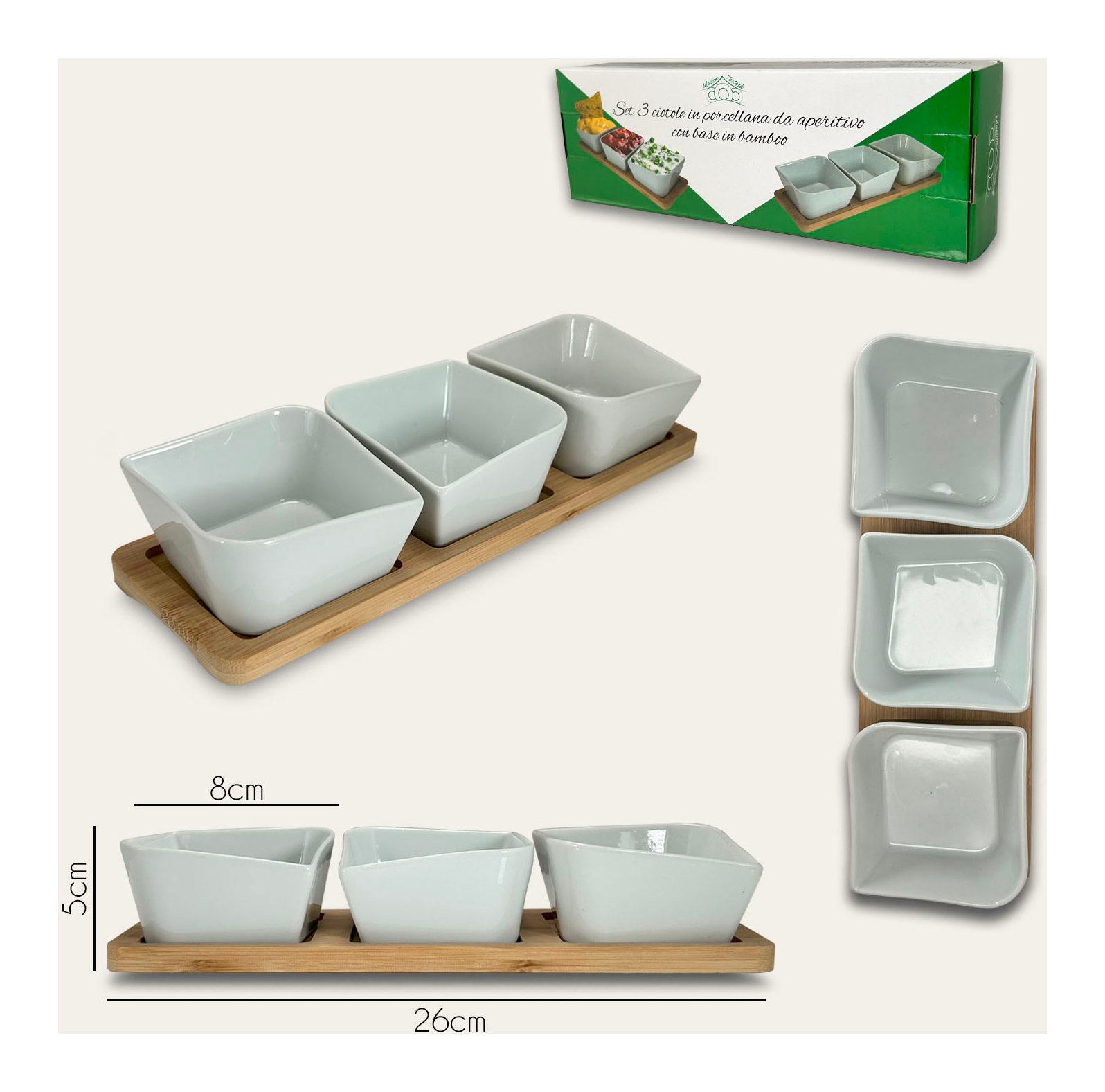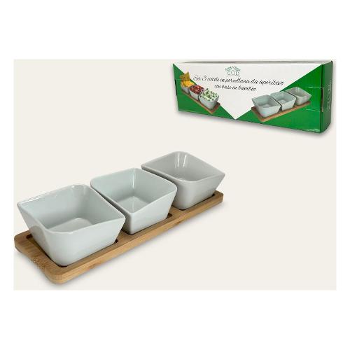 Set coppette Ceramica 3 pz (8cm) con vassoio bamboo 26 cm Bianco 956102