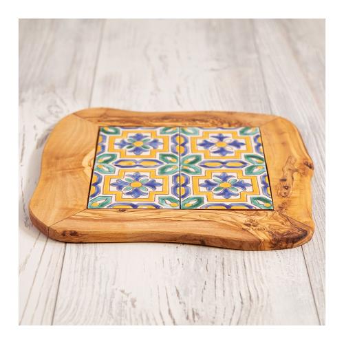Vassoio con 4 mattonelle ceramica decorata. Prodotto artigianale realizzato in legno di ulivo e caramica decorata.